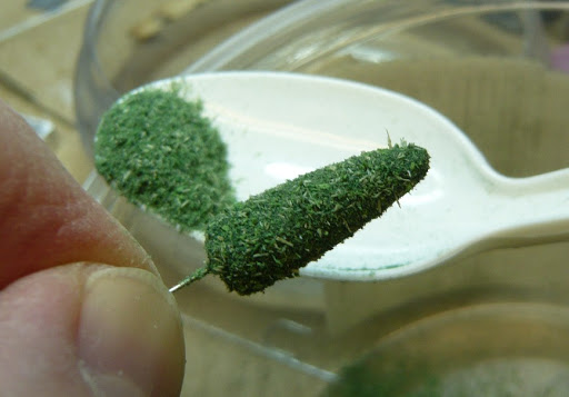 Then with the acrylic paint stil wet (very important), I apply the tainted saw dust with a plastic spoon. and shake off the excess. More detail on the kind of powder used to create the folliage on the next page..... |